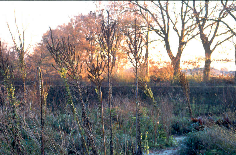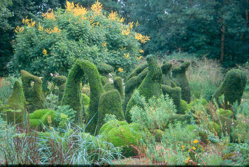 De geïdealiseerde harmonie in een symmetrische tuin met rechte hagen, een langwerpige rechte vijver in het midden en symmetrisch geplante bomen aan weerszijden ( die overigens nooit allemaal even hard willen groeien: weg harmonie!), is niet meer van deze tijd. Het is iets van lang geleden toen mensen bang waren voor de natuur, die overal aanwezig was, en de tuin ( letterlijk: omheining!) bedoeld was om de natuur buiten te sluiten. Tegenwoordig, nu de natuur om ons heen zo goed als verdwenen is, moet de kille, natuurvijandige omgeving buiten de omheining worden gehouden. De tuin erbinnen krijgt dan logischerwijze een andere vormgeving dan vroeger, want de natuur is niet symmetrisch. Grillig, scheef, of rond, de geïdealiseerde harmonie van de natuur weerspiegelend. Geïdealiseerd, want harmonie bestaat alleen in onze verbeelding, niet in de natuur. De tuin is en blijft een menselijke schepping: kunst (of kitsch), een illusie.