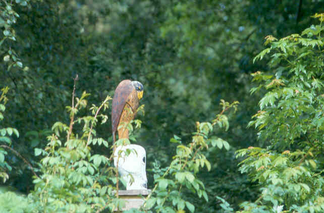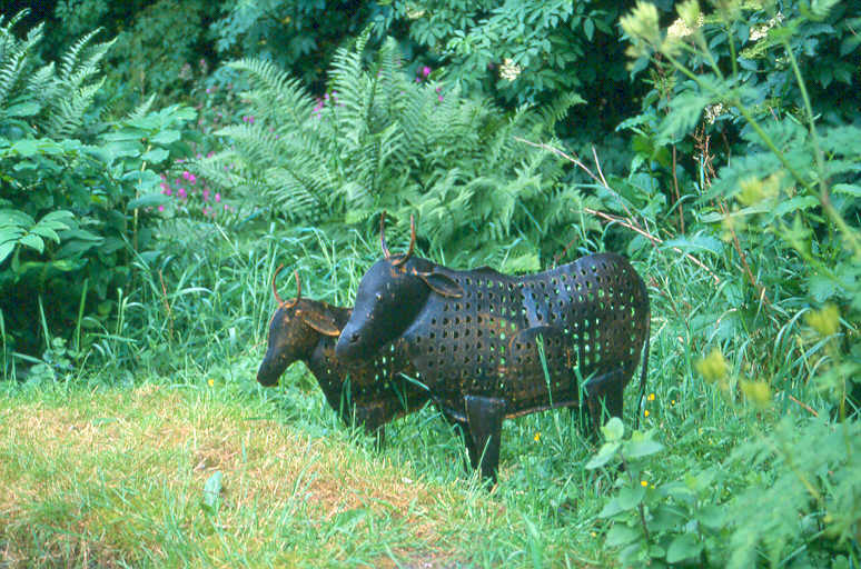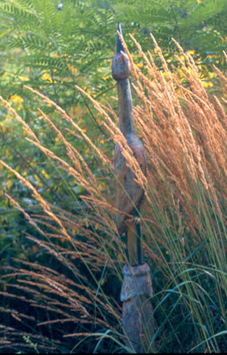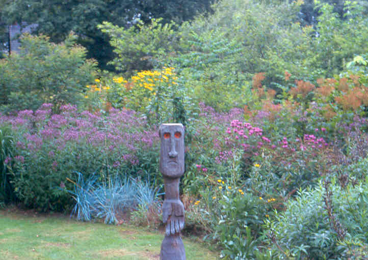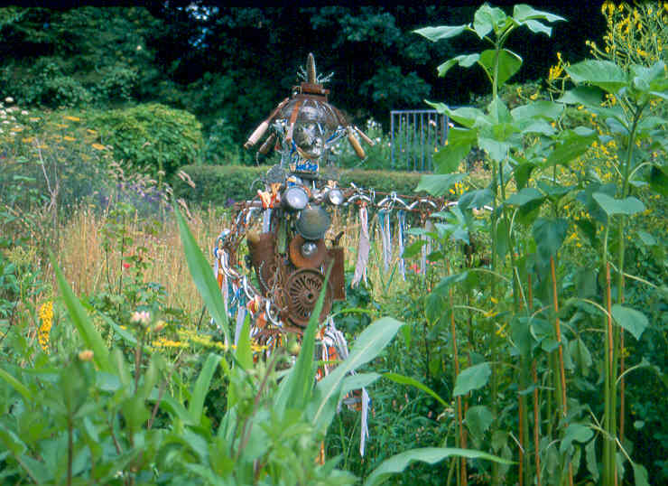Hoewel ik mijn tuin serieus neem, kan ik het niet laten om her en der (niet te vaak) objecten toe te passen, die vervreemdend werken, of op z'n minst een glimlach kunnen oproepen.