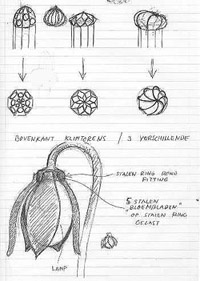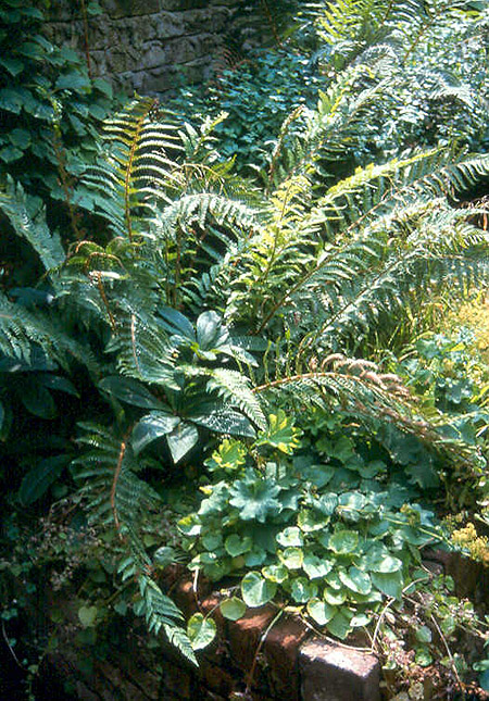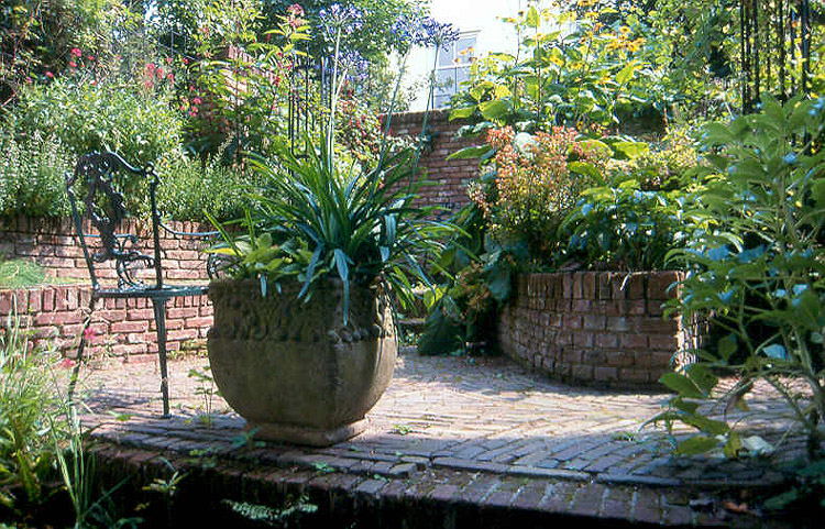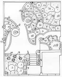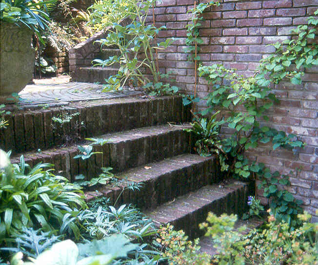The solution was found as follows: The blind wall has been replaced by a staircase as wide as the basement. Only a small part of it is fit to walk on, the largest part has been planted with shade-loving plants (Hearts Tongue Ferns!). The ground level has been lowered by 45 cms. for the garden to become visible from the basement. By additional terracing of the plantbeds in the garden (till 90 cms. above the former ground level) the visibility from the basement has been increased and space is suggested that does not really exist. The enormous difference in height (2,55 m. in a garden of merely 47 square metres) strengthens the feeling of a gorge, which already existed caused by the surrounding houses. The difference in height is further emphasised by three pillars for climbers. They replace trees, that would have caused too much shade.