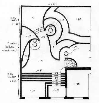 By way of curved stairs a second terrace can be reached, that is situated 45 cms. below the former ground level. The third terrace is situated at the former ground level and is connected with the second terrace by a few steps. All terraces have a mosaic floor of old bricks.