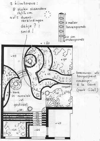 The wall around the garden is interrupted at the left side by a fence of reinforcing bars (meant for climbers) in order to meet the objections of the neighbours, who felt enclosed behind the wall.